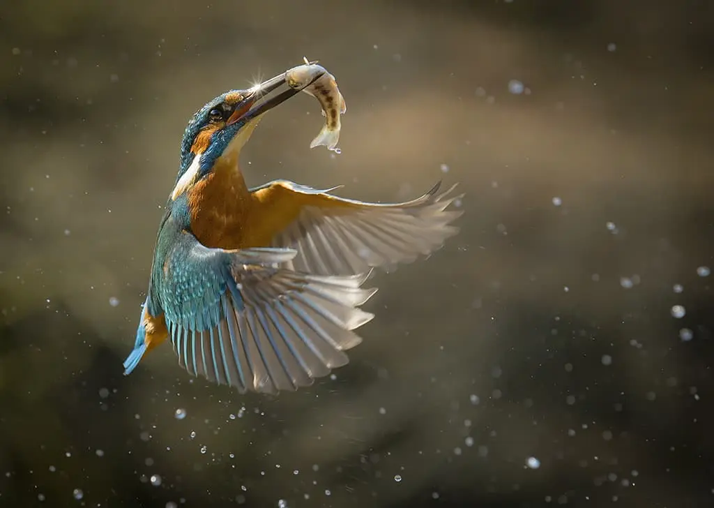 A kingfisher bird in flight holding a fish, illustrating the use of back button focusing for tracking fast-moving wildlife subjects