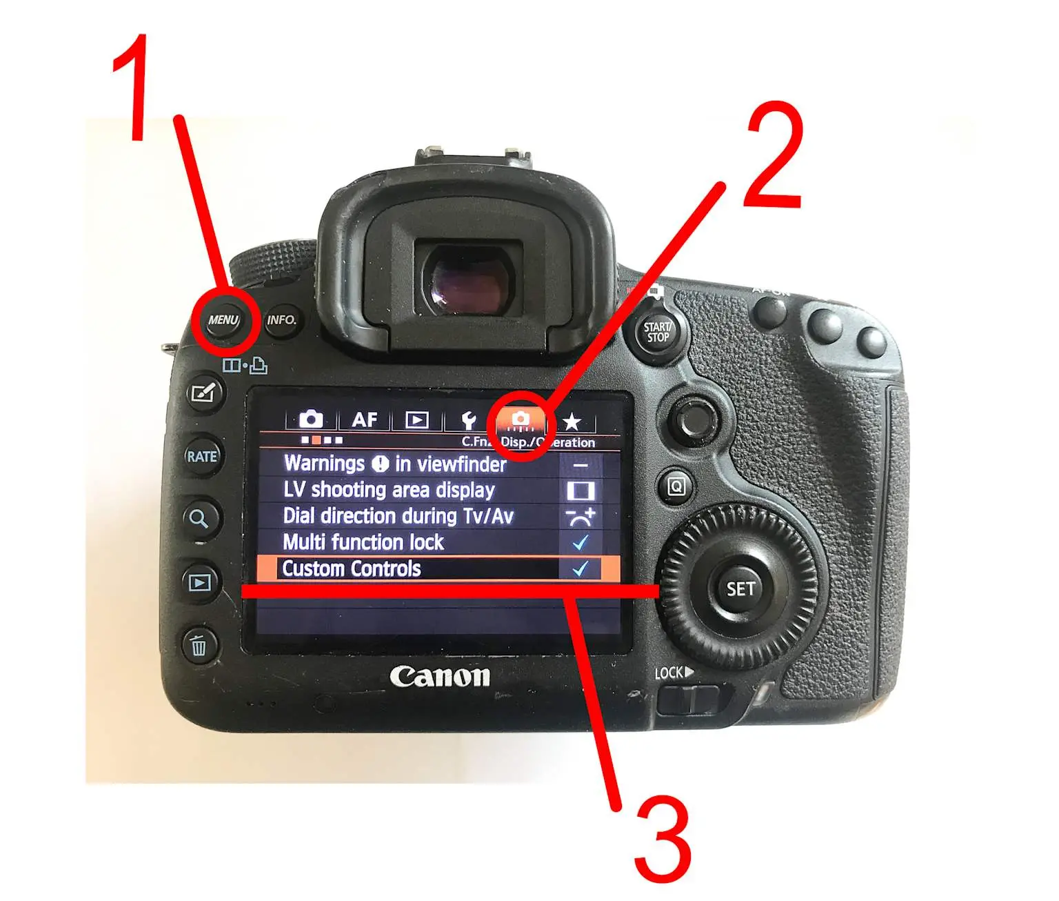 Accessing the Custom Controls menu on a Canon DSLR to set up back button focusing