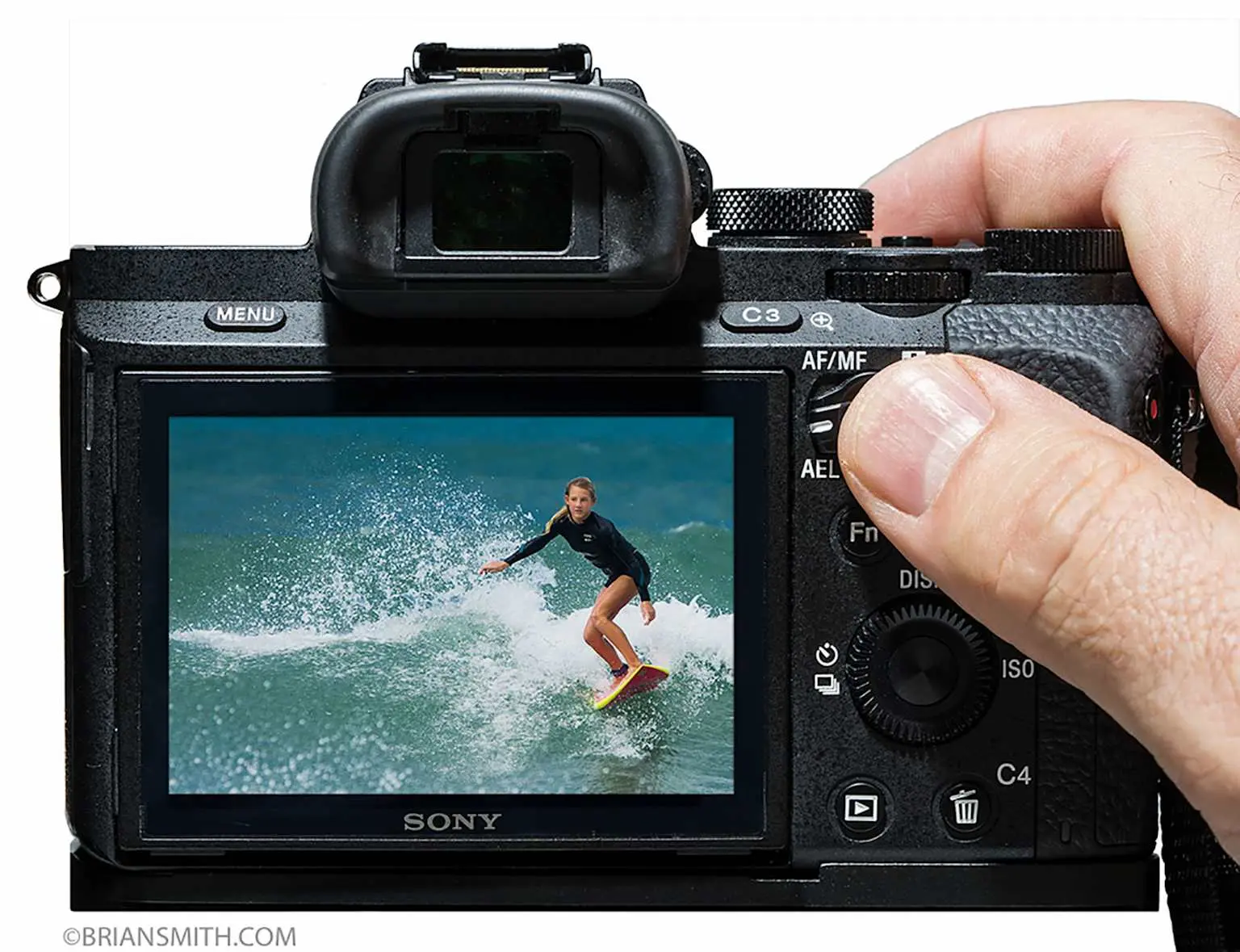 Adjusting the AF/MF and AEL switch on a Sony mirrorless camera to set up back button focusing, demonstrated with an action shot on the camera's LCD screen