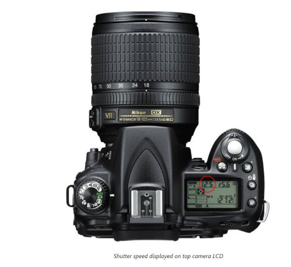 Do you know how to find what your camera shutter speed is set to? It is typically very easy to find it. On cameras that have a top panel, the shutter speed is typically located on the top left corner, as circled.